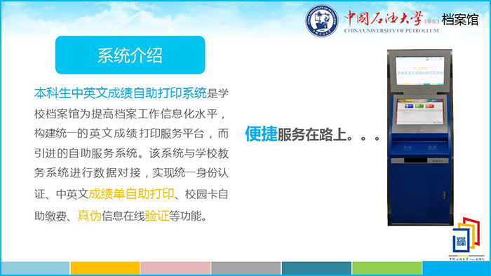 为提高档案工作信息化水平,方便学生获取英文成绩证明,档案馆自主研发了“本科生中英文成绩自助打印系统”,现已投入使用,系统操作指南如下:
