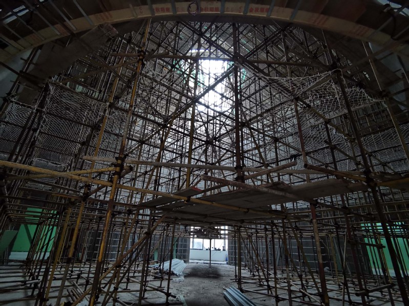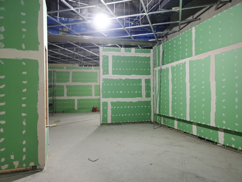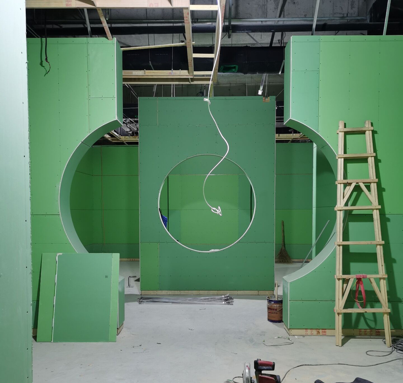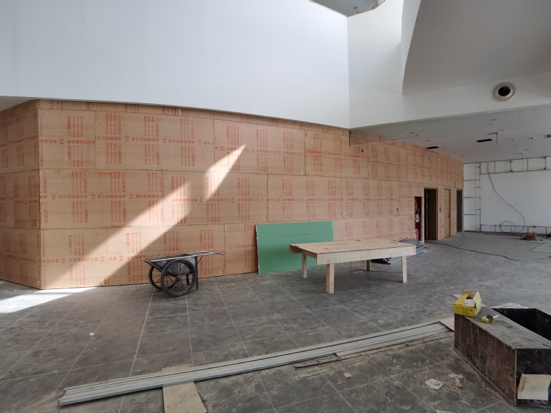 春和景明,阳光明媚,校史馆施工建设如火如荼。目前,校史馆编年体展区的墙面造型基本完成,耐潮石膏板全部贴完,消防管道安装与吊顶龙骨安装同步进行,电线施工已完成,艺术馆厅的场景造型已初步搭建成型。