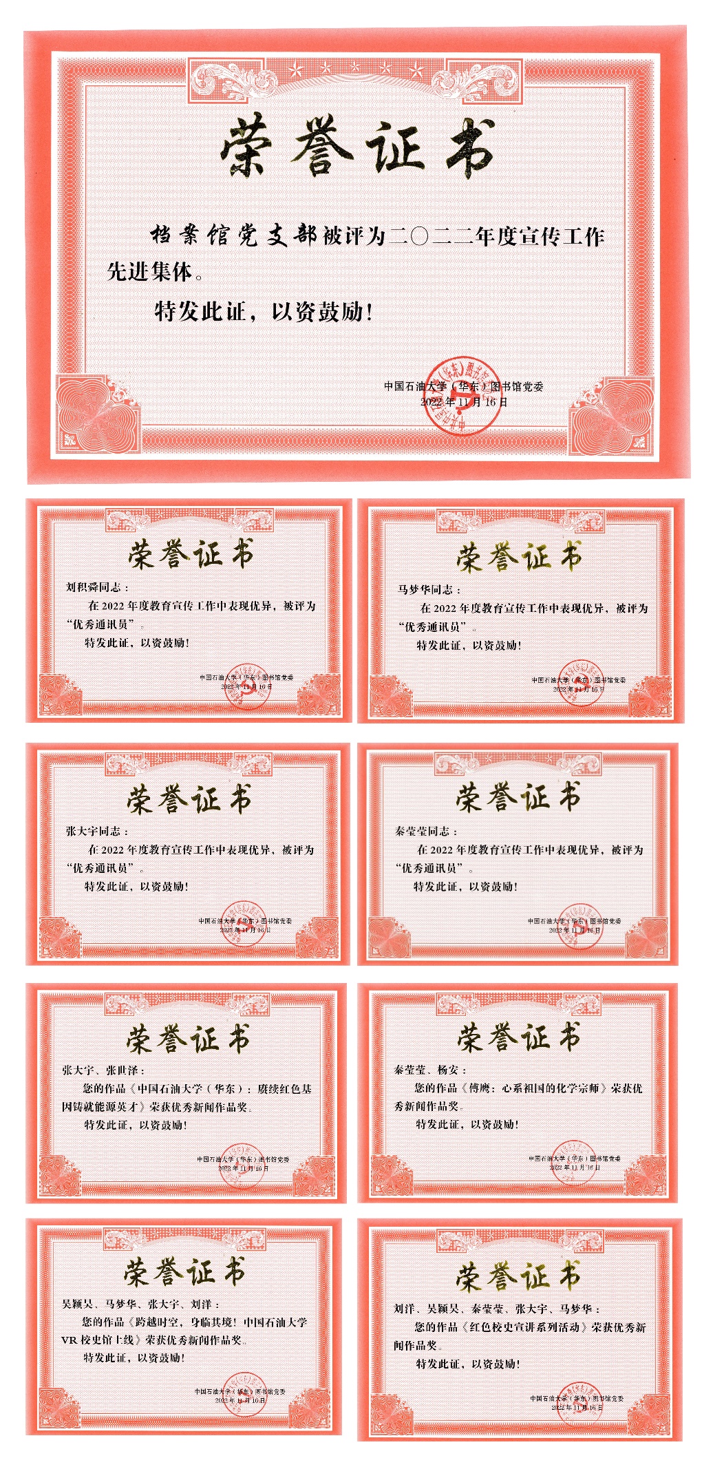 此次表彰结果依据《图书馆党委宣传工作表彰奖励办法(试行)》(图书馆党发[2022]3号),经各支部推荐、图书馆党委审核批准产生。档案馆党支部新闻作品数量和积分位居图书馆党委各支部榜首,支部多名同志和作品获得表彰,其中,档案馆党支部获评“宣传工作先进集体”,刘积舜、张大宇、秦莹莹、马梦华获评“优秀通讯员”,《中国石油大学(华东):赓续红色基因 铸就能源英才》《傅鹰:心系祖国的化学宗师》《跨越时空,身临其境!中国石油大学 VR 校史馆上线》《红色校史宣讲系列活动》四篇报道获评“优秀新闻作品”,校史宣讲团成员张春旺同学获评“优秀学生通讯员”。