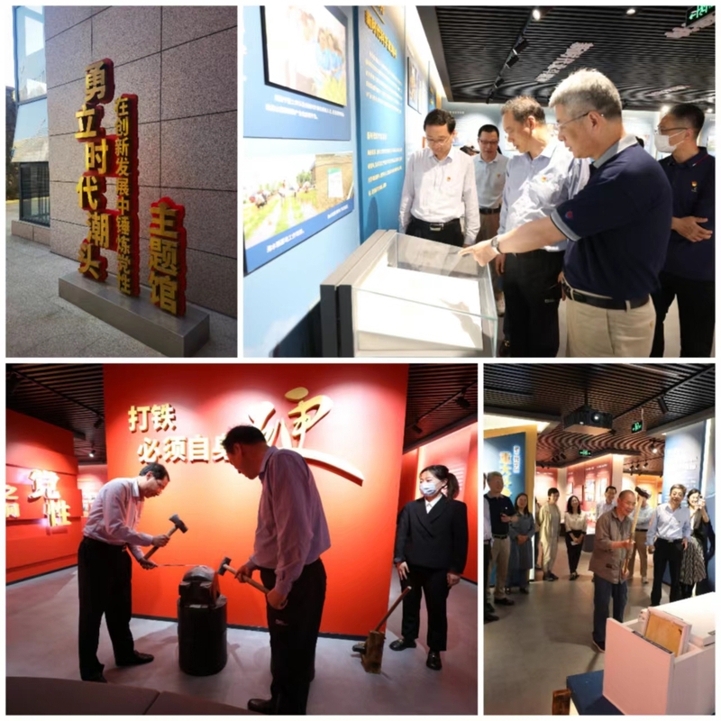 全体干部在讲解员的带领下体验了海尔砸冰箱场景、青岛港5G自动化码头全景及“一钩准”模拟操作、“蛟龙号”深潜及海底实物采集、“打铁必须自身硬”模拟打铁等一系列具有操作性、体验性、互动性的现场教学设施。通过一件件实物、一张张图片,一个个故事,详细了解了“勇立时代潮头”主题教育馆的珍贵资料。